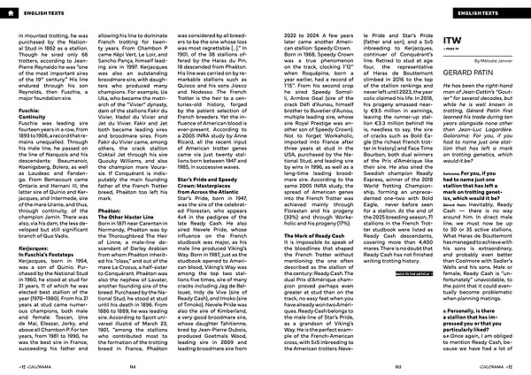 Phaëton: The Other Master Line Born in 1871 near Carentan in Normandy, Phaëton was by the Thoroughbred The Heir of Linne, a male-line descendant of Darley Arabian from whom Phaëton inherited his“ class,” and out of the mare La Crocus, a half-sister to Conquérant. Phaëton was also the nephew of Lavater, another founding sire of the breed. Purchased by the National Stud, he stood at stud until his death in 1896. From 1886 to 1889, he was leading sire. According to Sport universel illustré of March 23, 1901,“ among the stallions who contributed most to the formation of the trotting breed in France, Phaëton was considered by all breeders to be the one whose loss was most regrettable […].” In 1901, of the 38 stallions offered by the Haras du Pin, 18 descended from Phaëton. His line was carried on by remarkable stallions such as Quioco and his sons Jiosco and Nodesso. The French Trotter is the heir to a centuries-old history, forged by the patient selection of French breeders. Yet the influence of American blood is ever-present. According to a 2005 INRA study by Anne Ricard, all the recent input of American trotter genes came via just twenty stallions born between 1947 and 1985, in successive waves.