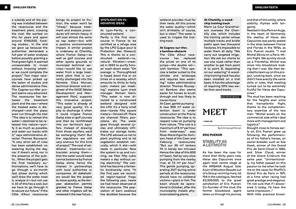a subsidy and all the piping was installed between the racecourse and the treatment plant, crossing the river. We worked on this for years and spent around € 140,000, funding studies … In the end we gave up because the authorities demanded a full year of water analyses before possibly granting a final green light. It seemed unreasonable to invest without knowing whether we could complete the project.” Two major racecourses have picked up the baton of studies and dense administrative files. The Cagnes-sur-Mer project seems very advanced. The racecourse lies between the treatment plant and the sea— where the treated water is discharged— and the pipes even run through the site!“ The idea is to retreat this water— destined to be released into nature— purify it as much as possible, and water our tracks with it,” says administrative director Thomas Roucayrol.“ A very strict set of rules has been established: no watering during the day, nor if there’ s wind, nor in the presence of the public … When the project gets the final necessary authorizations, we’ ll have to go through a six-month test phase during which we’ ll draw the water, treat it, analyze it— but not use it. All of this has a cost, but we have to go through it to secure our future.” If the Côte d’ Azur racecourse brings its project to fruition, the water won’ t be“ cheap,” because treatment and analysis procedures will remain heavy. It will cost almost the same as tap water— but with a positive environmental impact. A similar project is underway at Chantilly, where France Galop— as well as golf courses and other sports grounds or municipal technical services— would like to use water from a large treatment plant that is currently discharged into the Nonette. Clara Morvan, technical director and engineer of the SAGE( Water Development and Management Plan), supports this innovative project.“ This water is already of very good quality; it’ s a pity to discharge it when it could irrigate France Galop sites or golf courses and then be reinfiltrated into our territory’ s aquifers. Instead of drawing from those aquifers, we’ d be recharging them! But the regulations are still very onerous for this kind of project.” The cost of additional treatments— ultraviolet among them— that the water would need cannot be borne by France Galop alone, hence the interest in partnerships with local authorities or companies. All stakeholders would like the project to move quickly, as the tenyear abstraction permits granted to France Galop and other irrigators will be reviewed in the near future …