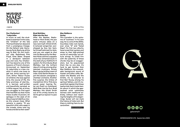 Feu Chatterton!“ Labyrinthe In music as well, the studbook is essential. In this case, the“ children” of the late Thomas Chatterton descend from a prestigious lineage. On the fathers’ side: Gainsbourg, Ferré, Bashung, all the way to Brel. On the mothers’ side: Radiohead, Pink Floyd, Chet Baker. Draped in a dandyism between pop and rock, Feu Chatterton! has become one of the beacons of French chanson. Announced on September 12, Labyrinthe is a new creation in which one loves to get lost. Amid soaring lyricism, Arthur Teboul muses on children, the race against time, the course of life, the false promises of eternity... It is learned, well-written and beautifully narrated, as in Mille vagues. Yet, at times, one struggles to find again that heartfelt cry that marks these erudite musicians. An epilogue in the style of Air( Sous la pyramide) thus closes this uneven maze. What remains is poetry:“ O you beautiful child, who weep in the crowds, come onto my horses and die to their swell.”