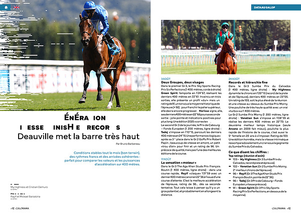 Dans le premier Gr. 3, le Prix Sky Sports Racing Prix Six Perfections( 1 400 mètres, corde à droite) Green Spirit l’ emporte en 1 ' 24 '' 67, réalisant les derniers 400 mètres en 22 '' 61. Invaincu en trois sorties, elle présente un profil « dur » mais un rating de 91, un ton sous la moyenne historique de l’ épreuve( ≈ 92): pour franchir le palier supérieur, elle devra encore progresser. Narissa signe, elle, ses derniers 400 mètres en 22 '' 66 pour sa seconde sortie: jolie pointe et indications positives pour plus long. Une édition 2025 « correcte ». Le second Gr. 3 de la journée, le Prix de Cabourg – Fonds Européen( 1 200 mètres, ligne droite): Tadej s’ impose en 1 ' 10 '' 15, parcourt les derniers 400 mètres en 24 '' 15. Une performance « logique » après sa 3 e place dans le Gr. 2 Goffs Prix Robert Papin; beaucoup de vitesse en amont, un petit « trou d’ air » pour finir et un rating de 96. Un précoce de qualité, mais pas l’ une des meilleures éditions de la course.