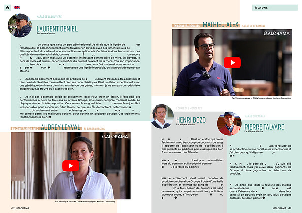 Galorama. Quel étalon vous a le plus marqué en termes de lignée? Laurent Deniel. Je pense que c’ est un peu générationnel. Je dirais que la lignée de Galileo est remarquable, et personnellement, j’ aime travailler en élevage avec des juments issues de Galileo. Elles apportent du cadre et une locomotion exceptionnels. Certains étalons transmettent ces qualités de manière admirable, comme Wootton Bassett, Lope de Vega, Gleneagles ou encore Persian King, qui, selon moi, aura un potentiel intéressant comme père de mère. En élevage, le père de mère est crucial, car environ 65 % du produit provient de la mère, d’ où son importance. Galileo, issu de Sadler’ s Wells et Northern Dancer, avec un côté maternel comprenant Urban Sea par Miswaki et Mr Prospector, représente une lignée incroyable, qui a produit de nombreux étalons.