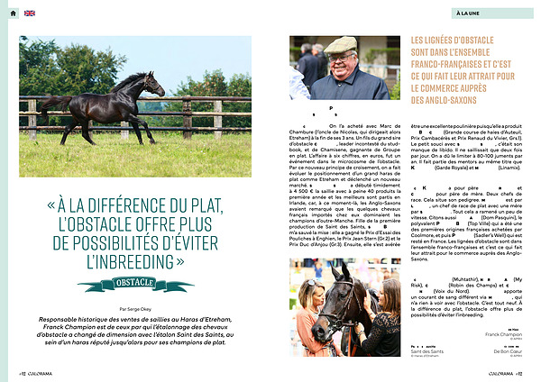 Responsable historique des ventes de saillies au Haras d’ Etreham, Franck Champion est de ceux par qui l’ étalonnage des chevaux d’ obstacle a changé de dimension avec l’ étalon Saint des Saints, au sein d’ un haras réputé jusqu’ alors pour ses champions de plat.