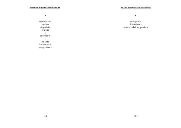 Marina Adamović – MELPOMENA 8 nije više bilo mačaka ni igračaka ni ičega i ja se rodih . od tada žalosne vrbe pevaju u horu 114