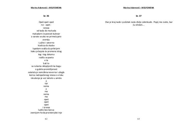 Marina Adamović – MELPOMENA br. 37 Ovo je kraj nade i početak rasta divlje zelenkade . Popij me cvete, bar ću olistati.... 63