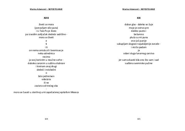 živeti se mora( ponavljam više puta) i Li Taio Po je živeo pa izvodim zaključak sledeće sadržine- mora se živeti e ti i ti on nema smisla ali i besmisao je neka odrednica recimo ja svoj koristim u neučne svrhe- duboko zaronim u suštinu dubioze i kreiram onaj drugi sledeći i neizbežni o biće jedinstven videćete ili ne zavisno od trećeg oka- mora se čuvati u sterilnoj urni zapečaćenoj epitafom Meseca