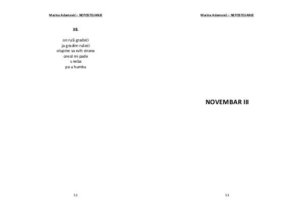 Marina Adamović – NEPOSTOJANJE 38. on ruši gradeći ja gradim rušeći olupine sa svih strana oreol mi pade s neba pa u humku 52