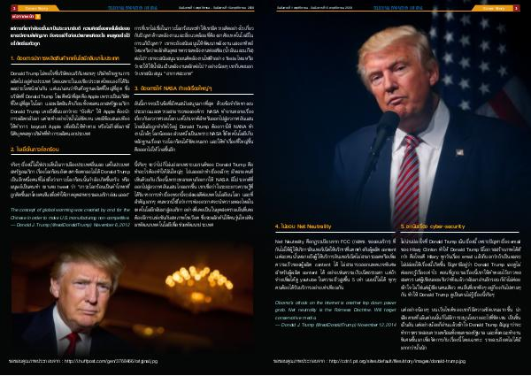 ไม่น่าแปลกใจที่ Donald Trump เน้นเรื่องนี้ เพราะปัญหาเรื่อง email ของ Hilary Clinton ท�ำให้ Donald Trump มีโอกาสสร้างภาพได้ดี กว่า คือโจมตี Hilary ทุกวันเรื่อง email แล้วก็บอกว่าถ้าเป็นผมจะ ไม่ปล่อยให้เรื่องนี้เกิดขึ้น ปัญหามีอยู่ว่า Donald Trump เองดูไม่ ค่อยจะรู้เรื ่องเท่าไร ตอนที่ถูกถามเรื่องนี ้เขาให้ค�ำตอบไว้ยาวพอ สมควร แต่ผู ้เขียนยอมรับว่าฟังแล้ว กลับมาอ่านอีกรอบ ก็ยังไม่ค่อย เข้าใจ ไม่ใช่แค่ผู้เขียนคนเดียว คนอื่นที่เขาฟังๆ อยู่ก็งงกันไปตามๆ กัน ท�ำให้ Donald Trump ดูเป็นคนไม่รู้เรื่องนี้จริงๆ