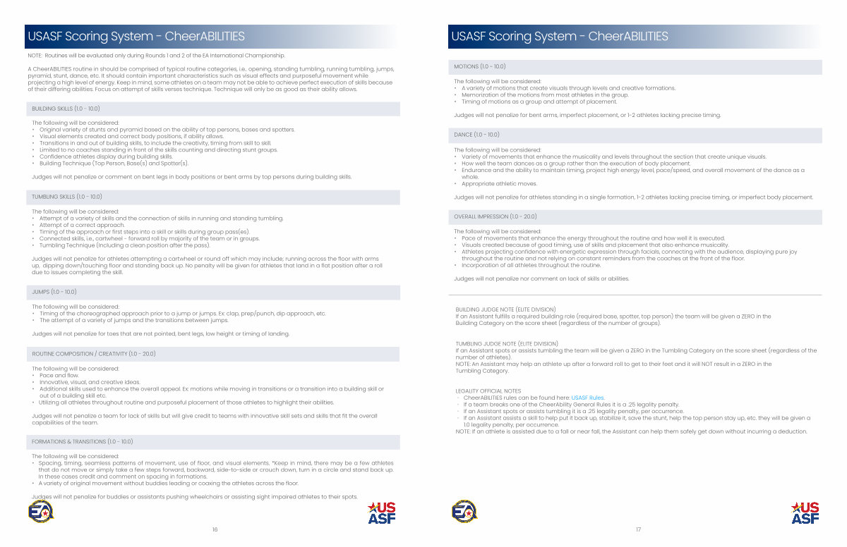 A CheerABILITIES routine in should be comprised of typical routine categories, i. e.. opening, standing tumbling, running tumbling, jumps, pyramid, stunt, dance, etc. It should contain important characteristics such as visual effects and purposeful movement while projecting a high level of energy. Keep in mind, some athletes on a team may not be able to achieve perfect execution of skills because of their differing abilities. Focus on attempt of skills verses technique. Technique will only be as good as their ability allows.