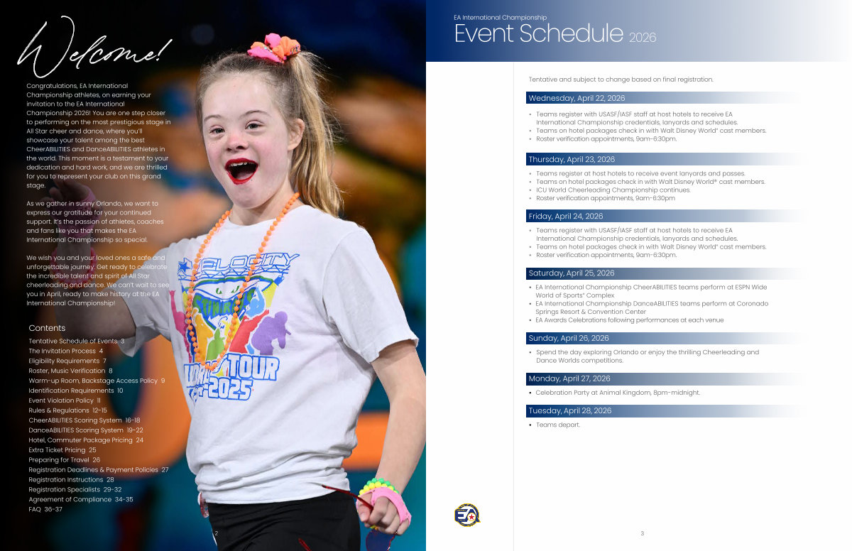 We wish you and your loved ones a safe and unforgettable journey. Get ready to celebrate the incredible talent and spirit of All Star cheerleading and dance. We can’ t wait to see you in April, ready to make history at the EA International Championship!