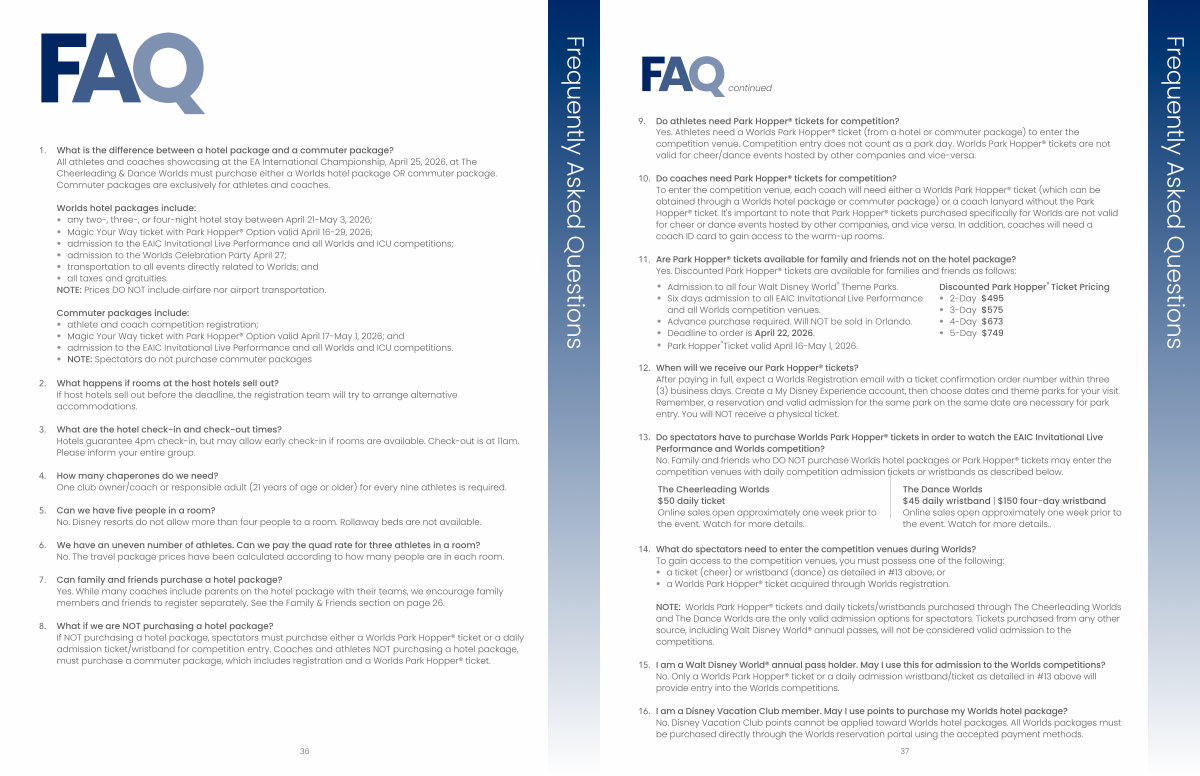 13. Do spectators have to purchase Worlds Park Hopper ® tickets in order to watch the EAIC Invitational Live Performance and Worlds competition? No. Family and friends who DO NOT purchase Worlds hotel packages or Park Hopper ® tickets may enter the competition venues with daily competition admission tickets or wristbands as described below.