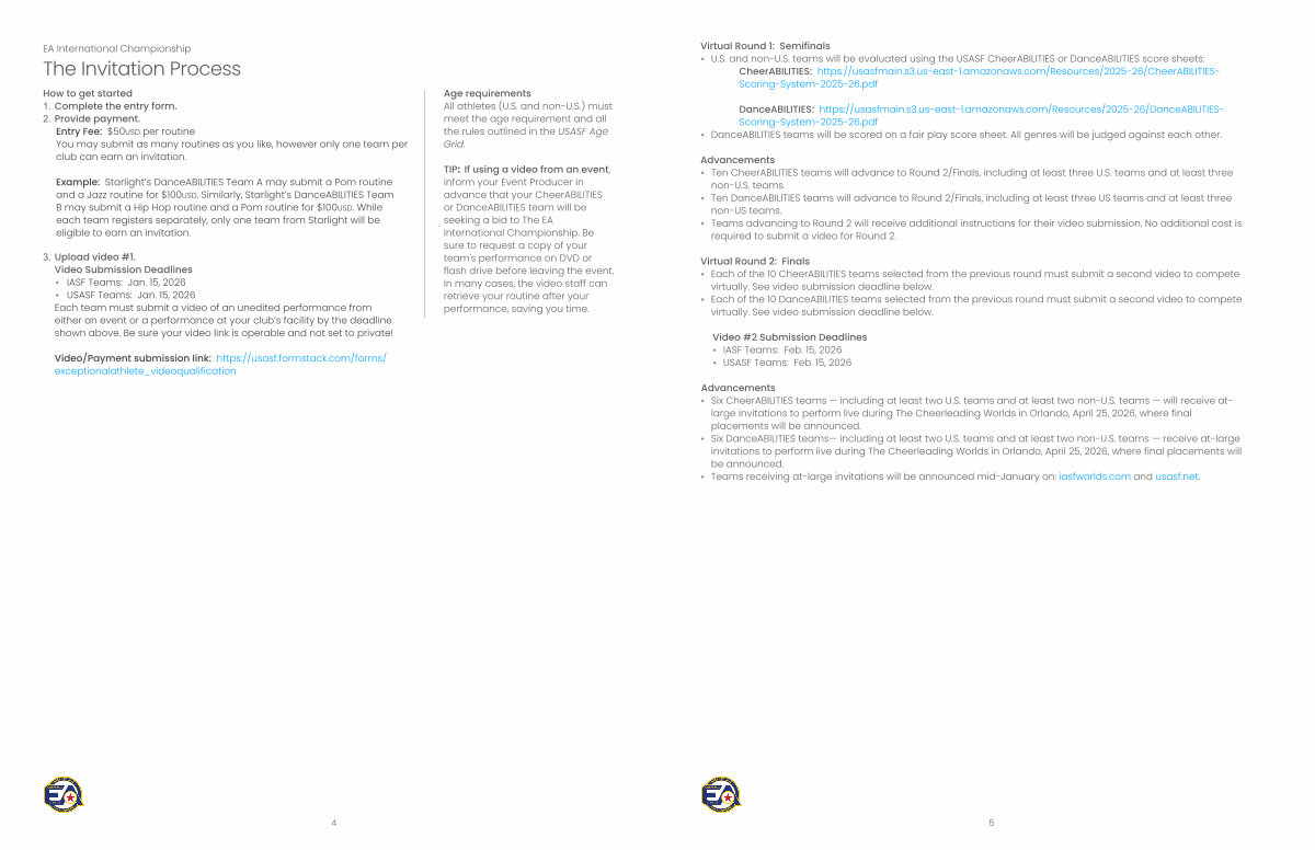 TIP: If using a video from an event, inform your Event Producer in advance that your CheerABILITIES or DanceABILITIES team will be seeking a bid to The EA International Championship. Be sure to request a copy of your team ' s performance on DVD or flash drive before leaving the event. In many cases, the video staff can retrieve your routine after your performance, saving you time.