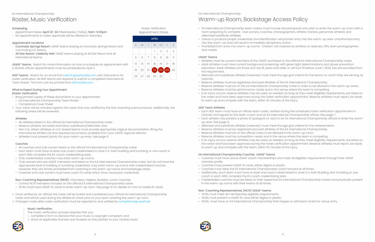 • Club owners who are USASF members and listed on the EA International Championship roster, but do not have the appropriate level of building or tumbling credentials, may enter warm-up rooms with credentialed coaches. However, they are strictly prohibited from coaching in the warm-up rooms and backstage areas.