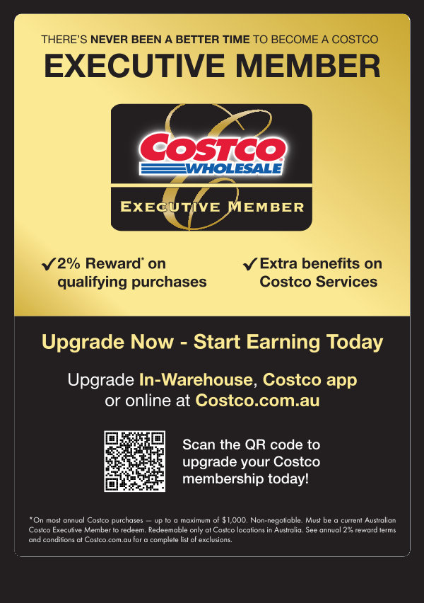 * On most annual Costco purchases— up to a maximum of $ 1,000. Non-negotiable. Must be a current Australian Costco Executive Member to redeem. Redeemable only at Costco locations in Australia. See annual 2 % reward terms and conditions at Costco. com. au for a complete list of exclusions.