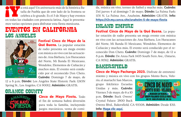 Festival Cinco de Mayo de la Qué Buena . La popular estación de radio presenta un mega evento con música en vivo con las actuaciones de : Ana Bárbara , Los Huracanes del Norte , Mi Banda El Mexicano , Wendolee , Elementos de Culiacán y muchos más . El evento será conducido por el reconocido Don Cheto . Cuándo : Domingo 7 de mayo , de 12 a 8 p . m . Dónde : Los Angeles State Historic Park : 1245N Spring St ., Los Angeles , CA 90012 . Admisión : GRATIS .