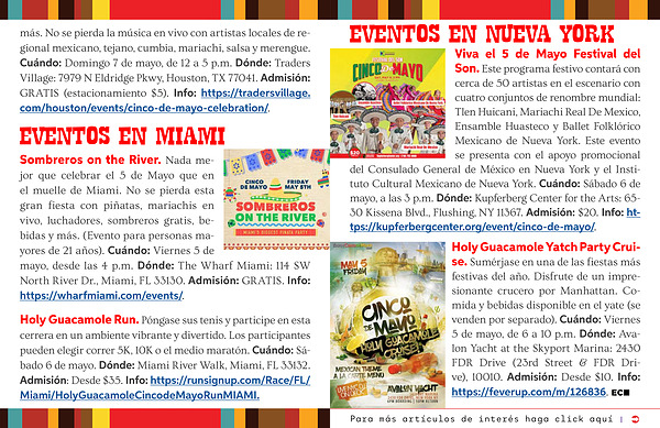 Holy Guacamole Run . Póngase sus tenis y participe en esta cerrera en un ambiente vibrante y divertido . Los participantes pueden elegir correr 5K , 10K o el medio maratón . Cuándo : Sábado 6 de mayo . Dónde : Miami River Walk , Miami , FL 33132 . Admisión : Desde $ 35 . Info : https :// runsignup . com / Race / FL / Miami / HolyGuacamoleCincodeMayoRunMIAMI .