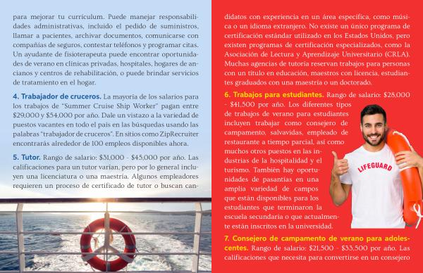 4 . Trabajador de cruceros . La mayoría de los salarios para los trabajos de “ Summer Cruise Ship Worker ” pagan entre $ 29,000 y $ 54,000 por año . Dale un vistazo a la variedad de puestos vacantes en todo el país en las búsquedas usando las palabras “ trabajador de cruceros ”. En sitios como ZipRecruiter encontrarás alrededor de 100 empleos disponibles ahora .