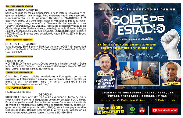 MANTENIMIENTO INDUSTRIAL Solicita Alumno mecánico . Conocimiento de la lectura Hidráulica . Y esquemas eléctricos una ventaja . Pero entrenará según sea necesario . Mantenimiento de la posición Hands-On . MAQUINARIA Y EQUIPAMIENTO . Los beneficios incluyen vacaciones pagadas , vacaciones pagas , programa 401-k . Semana de trabajo de 4 días ( 5:00AM- : 3:30pm ) LUNES-JUEVES . Familia de propiedad y ubicada en Ciudad del puerto . Medio ambiente de trabajo estable . Entorno bilingüe ( inglés y español ) Comience $ 19- $ 25 / hora . CONTACTO : Junior o Israel : ( 310 ) 534-0720 . Empresa de fabricación de Aeon . 937 W . 253 y D Street , Harbor City