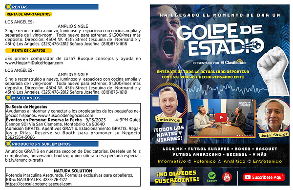 Su Socio de Negocios Ayudamos a informar y conectar a los propietarios de los pequeños negocios hispanos . www . susociodenegocios . com Eventos en Persona : Reserva la Fecha 9 / 13 / 2023 4-9PM Quiet Cannon 901 Via San Clemente , Montebello Ca 90640 Admisión GRATIS . Aperitivos GRATIS . Estacionamiento GRATIS . Regalos y Rifas . Reserve su Booth para promover su Negocio ( 562 ) 554-5066