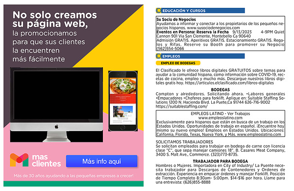 Su Socio de Negocios Ayudamos a informar y conectar a los propietarios de los pequeños negocios hispanos . www . susociodenegocios . com Eventos en Persona : Reserva la Fecha 9 / 13 / 2023 4-9PM Quiet Cannon 901 Via San Clemente , Montebello Ca 90640 Admisión GRATIS . Aperitivos GRATIS . Estacionamiento GRATIS . Regalos y Rifas . Reserve su Booth para promover su Negocio ( 562 ) 554-5066