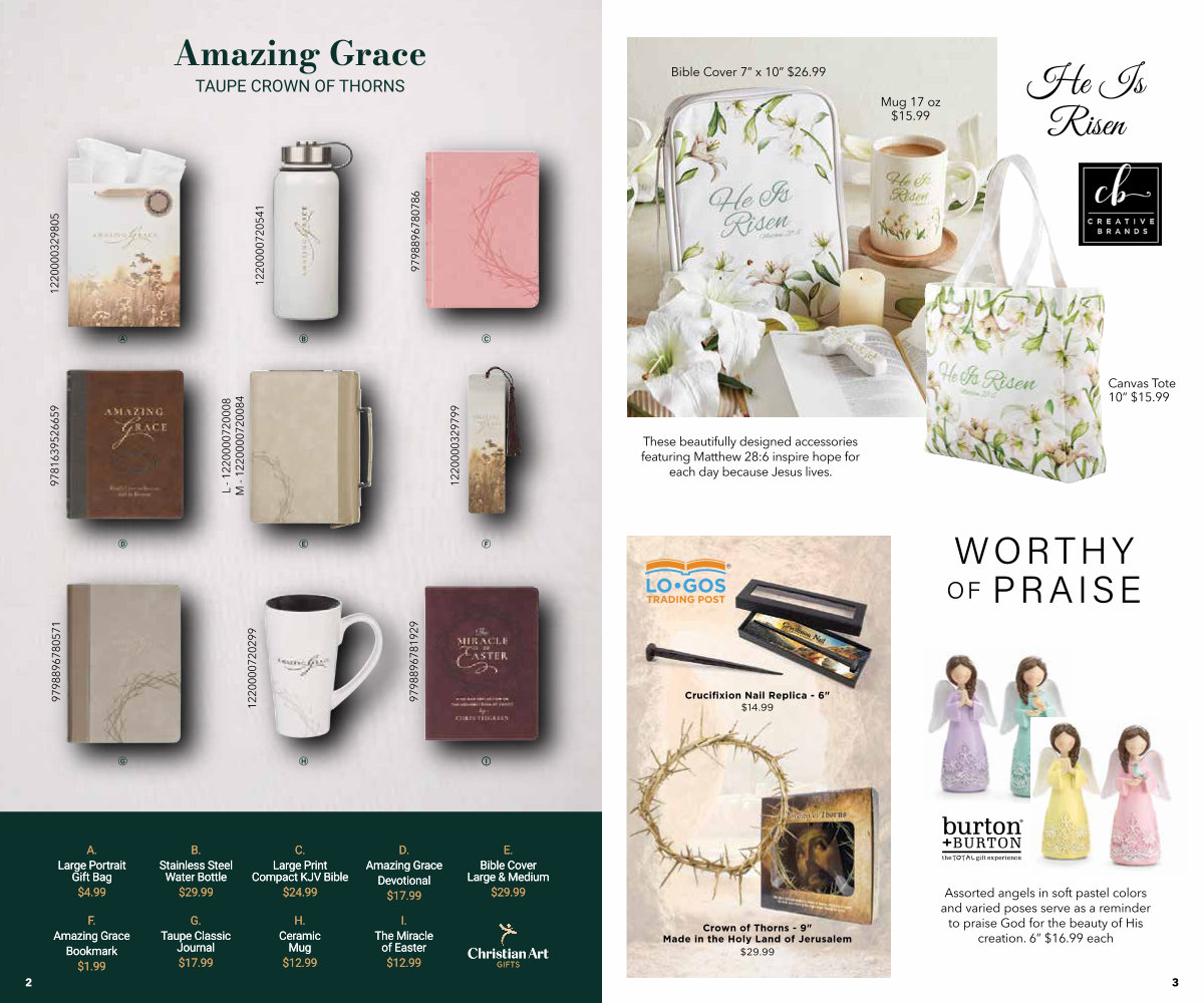 Floral Garden $ 29.99 A B C D E F G H I D. Amazing Grace Devotional $ 17.99 E. Bible Cover Large & Medium $ 29.99 C. Large Print Compact KJV Bible $ 24.99 B. Stainless Steel Water Bottle $ 29.99 A. Large Portrait Gift Bag $ 4.99 F. Amazing Grace Bookmark $ 1.99 G. Taupe Classic Journal $ 17.99 H. Ceramic Mug $ 12.99 I. The Miracle of Easter $ 12.99 D. Amazing Grace Devotional $ 17.99 E. Bible Cover Large & Medium $ 29.99 C. Large Print Compact KJV Bible $ 24.99 B. Stainless Steel Water Bottle $ 29.99 A. Large Portrait Gift Bag $ 4.99 F. Amazing Grace Bookmark $ 1.99 G. Taupe Classic Journal $ 17.99 H. Ceramic Mug $ 12.99 I. The Miracle of Easter $ 12.99 D. Amazing Grace Devotional $ 17.99 E. Bible Cover Large & Medium $ 29.99 C. Large Print Compact KJV Bible $ 24.99 B. Stainless Steel Water Bottle $ 29.99 A. Large Portrait Gift Bag $ 4.99 F. Amazing Grace Bookmark $ 1.99 G. Taupe Classic Journal $ 17.99 H. Ceramic Mug $ 12.99 I. The Miracle of Easter $ 12.99 Amazing Grace TAUPE CROWN OF THORNS 1220000329799 1220000720299 9781639526659 L- 1220000720008 M- 1220000720084 1220000329805 1220000720541 9798896780786 9798896780571 9798896781929 2