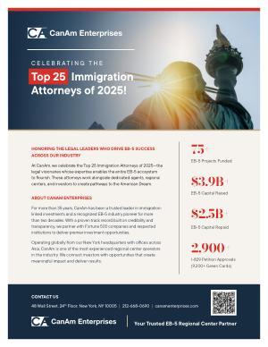 At CanAm, we celebrate the Top 25 Immigration Attorneys of 2025— the legal visionaries whose expertise enables the entire EB-5 ecosystem to flourish. These attorneys work alongside dedicated agents, regional centers, and investors to create pathways to the American Dream.
