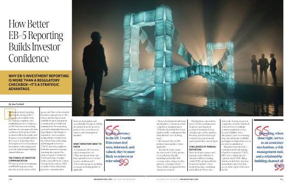 TTransparent, timely reporting is among the strongest EB-5 program tools available, both for ensuring compliance and establishing investor confidence. As EB-5 investors wait out long wait times for visa approvals, their confidence in the project tends to stand or fall on the quality and frequency of meaningful updates they receive. Reporting, when done right, serves as an assurance mechanism, a risk management tool, and a relationship-building channel all in one. THE STAKES OF INVESTOR COMMUNICATION EB-5 investors invest a minimum of $ 800,000 in projects that may take several years to yield a