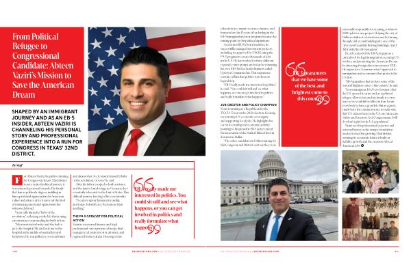 JOB CREATOR AND POLICY CHAMPION Vaziri is running as a Republican for the TX-CD 32 seat in the 2026 election, focusing on restoring U. S. economic sovereignty and supporting local jobs. He highlights his career in creating real economic activity, pointing to his proudest EB-5 achievement: the renovation of the Statler Hilton Hotel in downtown Dallas.