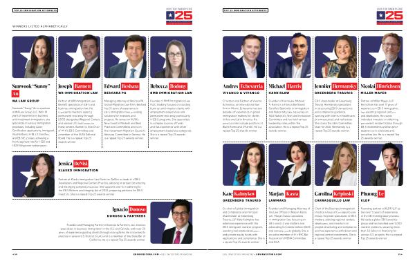 Chair of the Business Immigration Practice Group at Carrasquillo Law Group. Kripinski specializes in EB-5 matters, advising regional centers, developers, and investors on project structuring and compliance and has experience with direct and regional-center investments. She is a repeat Top 25 awards winner. |