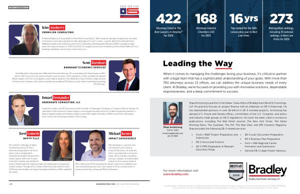 Shae Armstrong is partner in the Dallas, Texas office of Bradley Arant Boult & Cummings, LLP. His practice focuses on project finance with an emphasis on EB-5 financings. He has represented sponsors in over $ 6 billion in EB-5 involved projects. Armstrong has advised U. S. House and Senate offices, committees of the U. S. Congress, and policy and industry trade groups on EB-5 regulations. His work has been cited in numerous publications, including The Wall Street Journal, The New York Times, The Dallas Morning News, The Guardian, The Hill, The Real Deal, and EB5 Investors Magazine. Shae provides the following EB-5 related services: