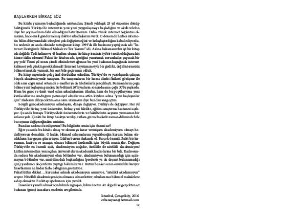 Sevgili genç akademisyen arkadaşım, dünya değişiyor. Türkiye de değişiyor. Her yıl Türkiye’ de birkaç yeni üniversite, birkaç yeni fakülte, eğitim-araştırma hastanesi açılıyor. Şu anda buraya Türkiye’ deki üniversitelerin ve fakültelerin sayısını yazmamın bir anlamı yok. Çünkü bu kitap baskıya verilip, raflara girene kadarki zaman diliminde bile bu sayının değişeceğinden eminim. Bundan neden söz ediyorum? Bu bilgilerin senin için önemi ne? Eğer şu anda bu kitabı almış ve okumaya karar vermişsen akademiysen olmayı hedefliyorsun demektir. O halde, bilimsel çalışmalarını yapabileceğin kurum bulma olasılıkların her geçen gün artıyor. Lütfen bunun farkında ol. Bu çok önemli. Sabit bir kurumun, kadron ve maaşın olması bilimsel üretkenlik için büyük avantajdır. Değişen Türkiye’ de en önemli açık, akademisyen açığıdır, özellikle de nitelikli akademisyen! Lütfen internetten yeni açılan üniversitelerin akademik kadrolarına bir bak. Kadrosunda sadece bir akademisyeni olan bölümler var, akademisyen bulunamadığı için açılamayan bölümler var, anabilim dalı başkanlığını( profesör ya da doçent bulunamadığı için) yardımcı doçentlerin yaptığı bölümler var. Bütün bunlar senin önündeki kariyer fırsatlarının ne kadar fazla olduğunu gösteriyor. Fakat lütfen dikkat … kurumlar aslında akademisyen aramıyor,“ nitelikli akademisyen” arıyor. Nitelikli akademisyen için olmazsa olmaz kriter; uluslararası bilimsel makalelere sahip olmaktır. Bu kitap işte bunun için yazıldı.