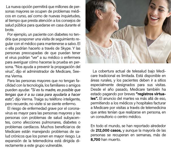 La nueva opción permitirá que millones de personas mayores se ocupen de problemas médicos en curso , así como de nuevas inquietudes , al tiempo que presta atención a los consejos de salud pública para quedarse en casa durante el brote . Por ejemplo , un paciente con diabetes no tendría que posponer una visita de seguimiento regular con el médico para mantenerse a salvo . El o ella podrían hacerlo a través de Skype . Y las personas preocupadas de que puedan tener el virus podrían “ ver ” a su médico o enfermera para averiguar cómo hacerse la prueba en persona . “ Nos ayuda a prevenir la propagación del virus ”, dijo el administrador de Medicare , Seema Verma . Para las personas mayores que no tengan facilidad con la tecnología , los familiares o amigos pueden ayudar . “ Si es tu madre , es posible que tengas que ir a su casa para ayudarla a hacer esto ”, dijo Verma . Traiga su teléfono inteligente , pero recuerde , no visite si se siente enfermo . El riesgo de enfermedad grave por el coronavirus es mayor para las personas mayores y las personas con problemas de salud subyacentes , como afecciones pulmonares , diabetes o problemas cardíacos . Muchos beneficiarios de Medicare están manejando problemas de salud crónicos que los ponen en mayor riesgo . La expansión de la telemedicina está dirigida directamente a este grupo vulnerable .