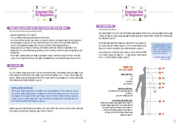 사용하는 것이 좋습니다. 새로운 오일을 처음 바를 때 에센셜 오일을 캐리어 오일과 희석해서 사용하면 피부가 민감하게 반응