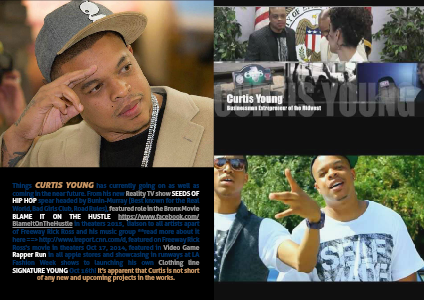 Things CURTIS YOUNG has currently going on as well as coming in the near future. From his new Reality TV show SEEDS OF HIP HOP spear headed by Bunin-Murray (Best known for the Real World, Bad Girls Club, Road Rules), featured role in the Bronx Movie BLAME IT ON THE HUSTLE https://www.facebook.com/BlameItOnTheHustle in theaters 2015, liaison to all artists apart of Freeway Rick Ross and his music group **read more about it here ==> http://www.ireport.cnn.com/d, featured on Freeway Rick Ross's movie in theaters Oct 17, 2014, featured in Video Game Rapper Run in all apple stores and showcasing in runways at LA Fashion Week shows to launching his own Clothing line SIGNATURE YOUNG Oct 16th! It's apparent that Curtis is not short of any new and upcoming projects in the works.