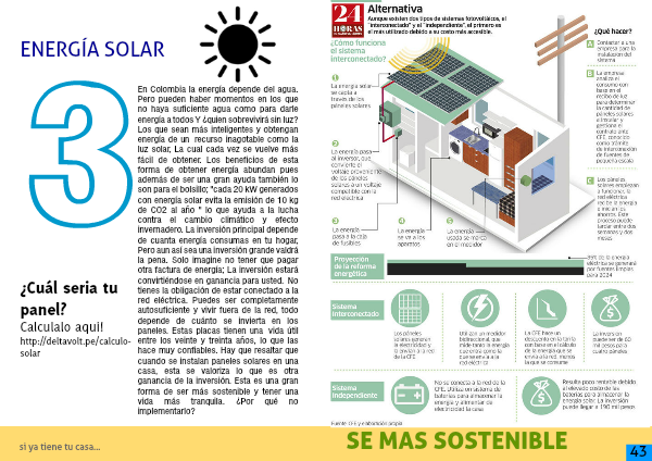 En Colombia la energía depende del agua. Pero pueden haber momentos en los que no haya suficiente agua como para darle energía a todos Y ¿quien sobrevivirá sin luz? Los que sean más inteligentes y obtengan energía de un recurso inagotable como la luz solar, La cual cada vez se vuelve más fácil de obtener. Los beneficios de esta forma de obtener energía abundan pues además de ser una gran ayuda también lo son para el bolsillo; "cada 20 kW generados con energía solar evita la emisión de 10 kg de CO2 al año " lo que ayuda a la lucha contra el cambio climático y efecto invernadero. La inversión principal depende de cuanta energía consumas en tu hogar, Pero aun así sea una inversión grande valdrá la pena. Solo imagine no tener que pagar otra factura de energía; La inversión estará convirtiéndose en ganancia para usted. No tienes la obligación de estar conectado a la red eléctrica. Puedes ser completamente autosuficiente y vivir fuera de la red, todo depende de cuánto se invierta en los paneles. Estas placas tienen una vida útil entre los veinte y treinta años, lo que las hace muy confiables. Hay que resaltar que cuando se instalan paneles solares en una casa, esta se valoriza lo que es otra ganancia de la inversión. Esta es una gran forma de ser más sostenible y tener una vida más tranquila. ¿Por qué no implementarlo?