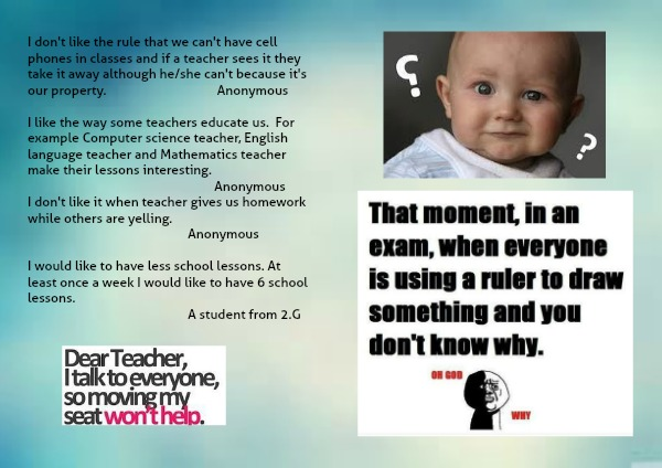 I don't like the rule that we can't have cell phones in classes and if a teacher sees it they take it away although he/she can't because it's our property. Anonymous