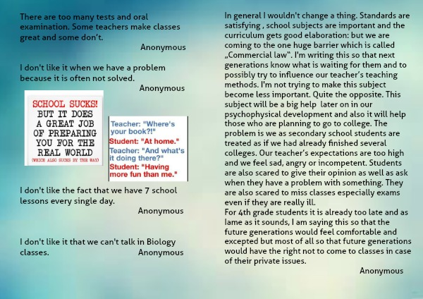 In general I wouldn't change a thing. Standards are satisfying , school subjects are important and the curriculum gets good elaboration: but we are coming to the one huge barrier which is called „Commercial law“. I'm writing this so that next generations know what is waiting for them and to possibly try to influence our teacher’s teaching methods. I'm not trying to make this subject become less important. Quite the opposite. This subject will be a big help later on in our psychophysical development and also it will help those who are planning to go to college. The problem is we as secondary school students are treated as if we had already finished several colleges. Our teacher’s expectations are too high and we feel sad, angry or incompetent. Students are also scared to give their opinion as well as ask when they have a problem with something. They are also scared to miss classes especially exams even if they are really ill.