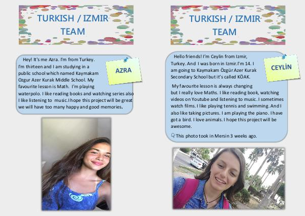 Hello friends! I’ m Ceylin from Izmir, Turkey. And I was born in Izmir. I ' m 14. I am going to Kaymakam Özgür Azer Kurak Secondary School but it’ s called KÖAK.