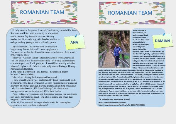 Hello, my name is Damian Stefan, I ' m twelve years old and I ' m from Romania. I‘ m tall and slim, I have got straight light brown hair and brown eyes and I prefer casual clothes. My favourite colour is blue. I live in a small and nice flat with my family. My brother Petrica is twenty-eight years old and he is a security guardian. My mother ' s name is Olimpia, she is 51 years old and works in a Supermarket. My father ' s name is Aristide, he is 53 and works in delivery services I study at " George Valsan " Secondary School and I am in 6th grade. My favourite school subjects are: Romanian, English and Geography I really love cars, they are my passion. My favourite car is the Peugeot 407, I like the light blue ones and the silver coloured ones. In my spare time I like walking in the park with my friends or swimming in our lake. Amara is a beautiful city in the Ialomita county, it has the most famous dendrological park in the South-Est of Romania and the beautiful lake Amara, wellknown for a sediment used in rheumatology due to its therapeutic properties. In the future I see myself as a policeman. I ' d like to apply for a job at S. R. I( Romanian Service of Informations). My hobby is Kendama, I play it with my classmates and my friends every day, during the break and I ' m proud of my skills. I would describe myself as a sociable, outgoing and funny person, a bit bussy sometimes, a bit shy sometimes. Two years ago I participate in a Erasmus project and I visited Greece. It was an amazing experience and I’ d like to visit all the countries in the world!