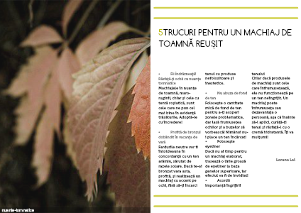 Machiajele în nuanțe de toamnă, maro-ruginii, chiar și cele cu tentă roșiatică, sunt cele care ne pun cel mai bine în evidență trăsăturile. Adoptă-le cu încredere!