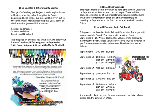 This year's One Day 4-H Project is assisting Louisiana 4-H with collecting school supplies for South Louisiana. These school supplies will be given out to those who were hit with flooding this year. Some of the items that you could donate are...