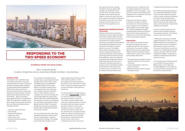 INTRODUCTION The pandemic had a substantial impact on the Gold Coast business community , exacerbated due to the city ’ s economic and business composition largely comprising of small businesses ( Flew and Kirkwood , 2021 ). The two-speed economy was prevalent among businesses , where some experienced a surge in growth , and others experienced a significant decline during the pandemic – typical of economies during significant structural change ( Perlich , 2013 ). This caused flow on impacts to local labour markets and businesses . During this time , local businesses identified several challenges including :