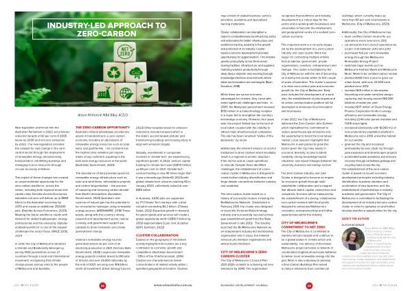This important work is in its early stages , led by the development of a Zero-Carbon Industry and Jobs Cluster . Work has begun on connecting multiple entities from academia , government , private organisations , investors , entrepreneurs and startups . The cluster is facilitated by the City of Melbourne with the aim of becoming an industry-led cluster within its first couple of years of operation . The cluster ’ s purpose is to drive zero-carbon jobs and economic growth for the City of Melbourne . Early work includes the development of a work plan , the establishment of jobs targets and an online communication platform will be developed to showcase local innovation and businesses .