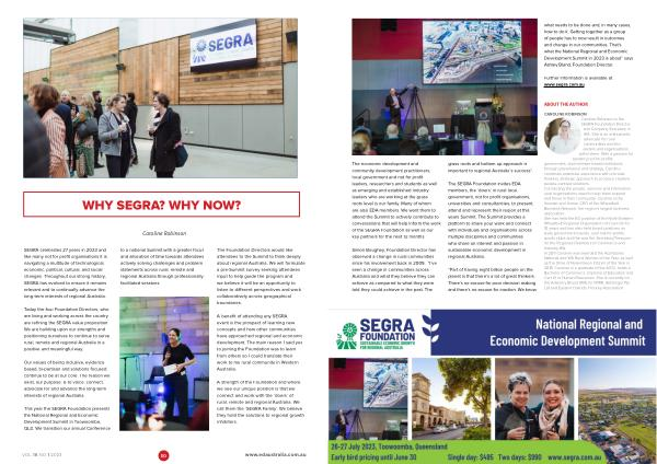 This year the SEGRA Foundation presents the National Regional and Economic Development Summit in Toowoomba , QLD . We transition our annual Conference to a national Summit with a greater focus and allocation of time towards attendees actively solving challenges and problem statements across rural , remote and regional Australia through professionally facilitated sessions .