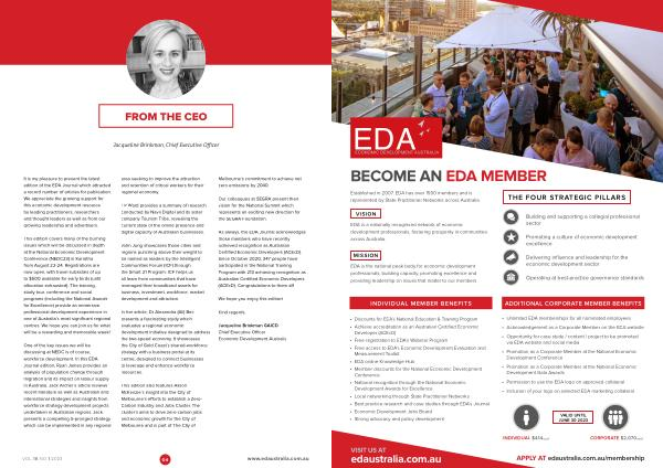 EDA is the national peak body for economic development professionals ; building capacity , promoting excellence and providing leadership on issues that matter to our members .