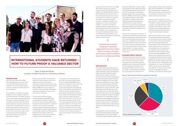 ECONOMIC IMPACT RESULTS International education was found to have a significant contribution to the local Gold Coast economy . The economic impact assessment found international students equated to approximately 50 % of the total education and training industry ’ s Gross Value Added ( GVA ) for the year ending June 2022 . The value-added contribution was not exclusive to the education and