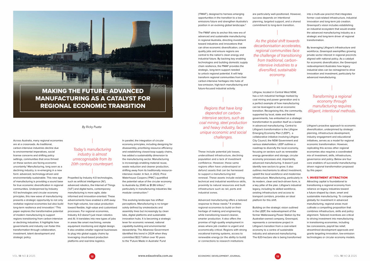 Across Australia, many regional economies are at a crossroads. As traditional, carbon-intensive industries decline due to environmental imperatives, social license concerns and shifting policy settings, communities that once thrived on these sectors are facing economic uncertainty. 1 Manufacturing, long seen as a declining industry, is re-emerging in a new form: advanced, technology-driven and environmentally sustainable. This new age of manufacturing is providing a sound base for true economic diversification in regional communities. Underpinned by Industry 4.0 technologies and circular economy principles, this new wave of manufacturing presents a strategic opportunity to not only revitalise regional economies but also build long-term resilience and innovation. 2 This paper explores the transformative potential of modern manufacturing to support regions transitioning from carbon-intensive or declining industries. It highlights how governments and industry can foster this transformation through collaboration, investment, talent development and strategic policy.
