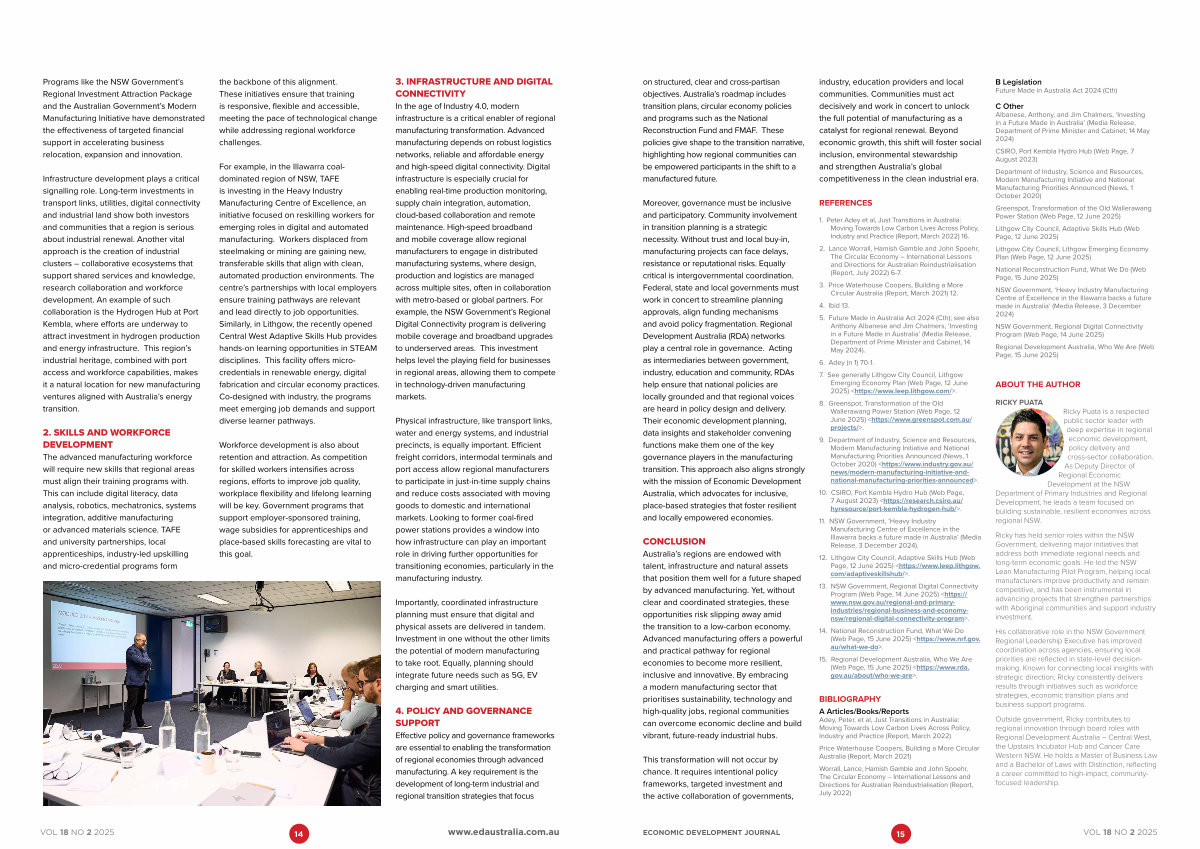 Infrastructure development plays a critical signalling role. Long-term investments in transport links, utilities, digital connectivity and industrial land show both investors and communities that a region is serious about industrial renewal. Another vital approach is the creation of industrial clusters – collaborative ecosystems that support shared services and knowledge, research collaboration and workforce development. An example of such collaboration is the Hydrogen Hub at Port Kembla, where efforts are underway to attract investment in hydrogen production and energy infrastructure. This region’ s industrial heritage, combined with port access and workforce capabilities, makes it a natural location for new manufacturing ventures aligned with Australia’ s energy transition.