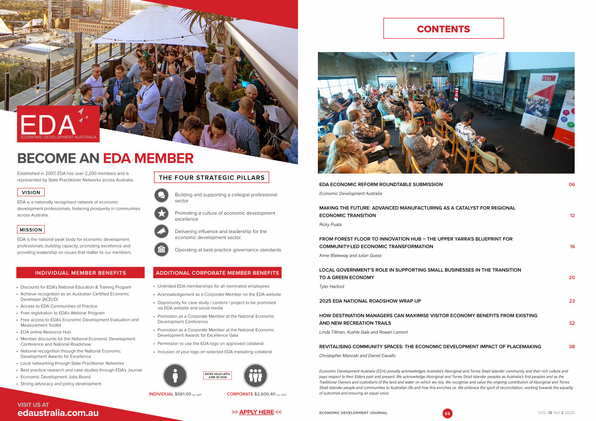 Economic Development Australia( EDA) proudly acknowledges Australia’ s Aboriginal and Torres Strait Islander community and their rich culture and pays respect to their Elders past and present. We acknowledge Aboriginal and Torres Strait Islander peoples as Australia’ s first peoples and as the Traditional Owners and custodians of the land and water on which we rely. We recognise and value the ongoing contribution of Aboriginal and Torres Strait Islander people and communities to Australian life and how this enriches us. We embrace the spirit of reconciliation, working towards the equality of outcomes and ensuring an equal voice.