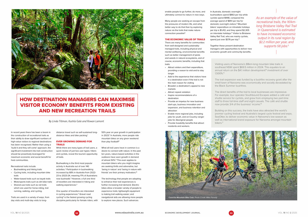 In recent years there has been a boom in the construction of recreational trails as their ability to draw significant numbers of high-value visitors to regional destinations has been recognised. Rather than using a‘ build it and they will come’ approach, the significant investment into trail construction should be proactively leveraged for maximum economic and social benefit for host communities.