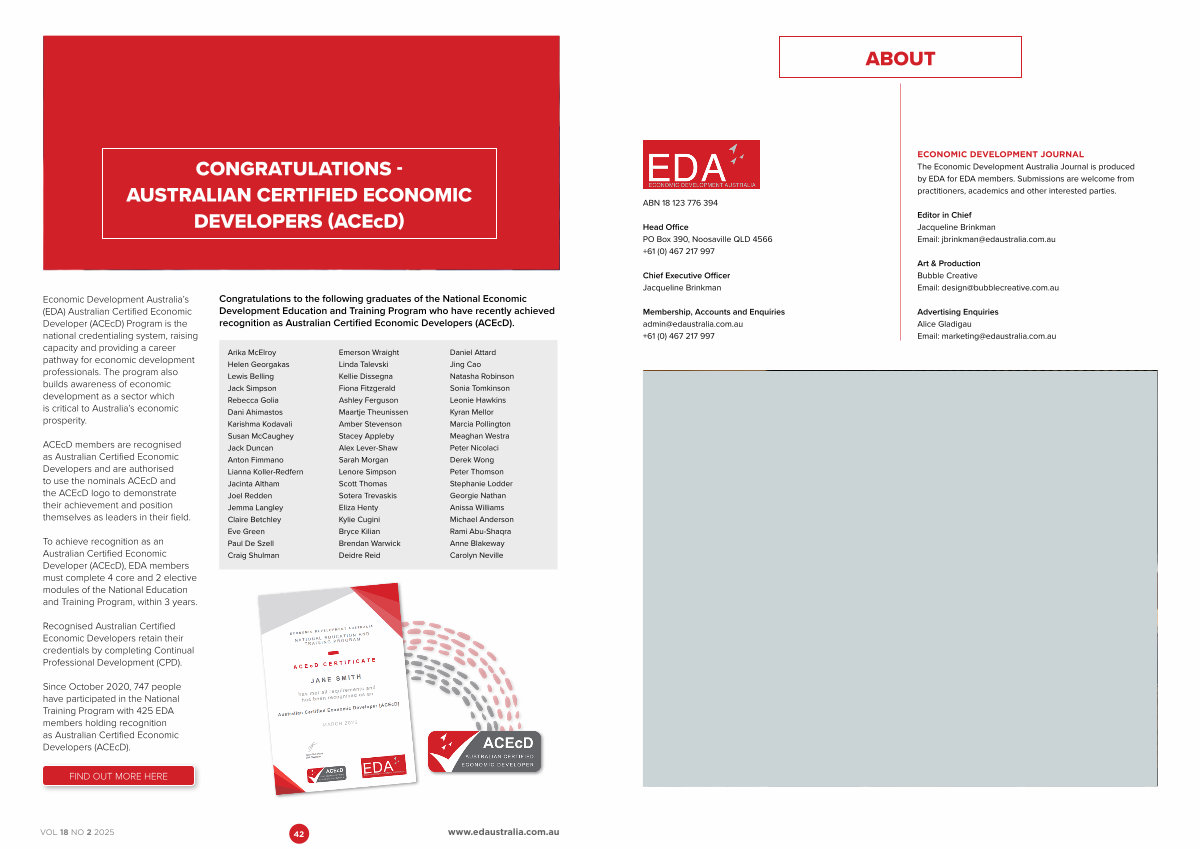 Congratulations to the following graduates of the National Economic Development Education and Training Program who have recently achieved recognition as Australian Certified Economic Developers( ACEcD).